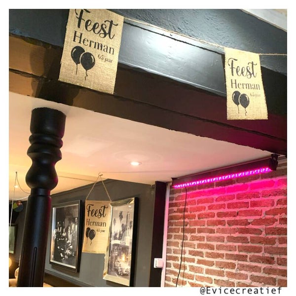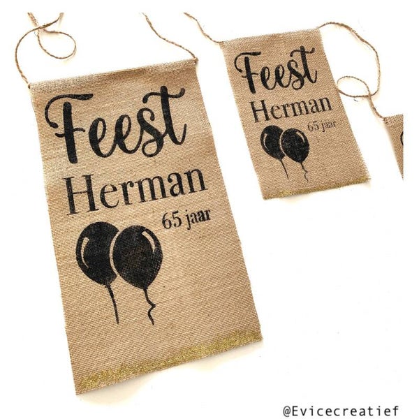 Slinger van jute vlaggen met tekst en of leeftijd.