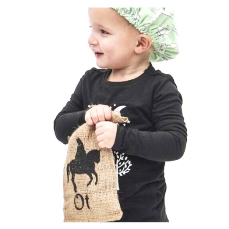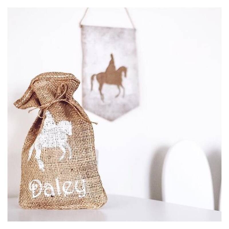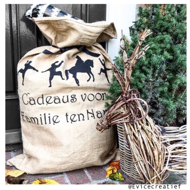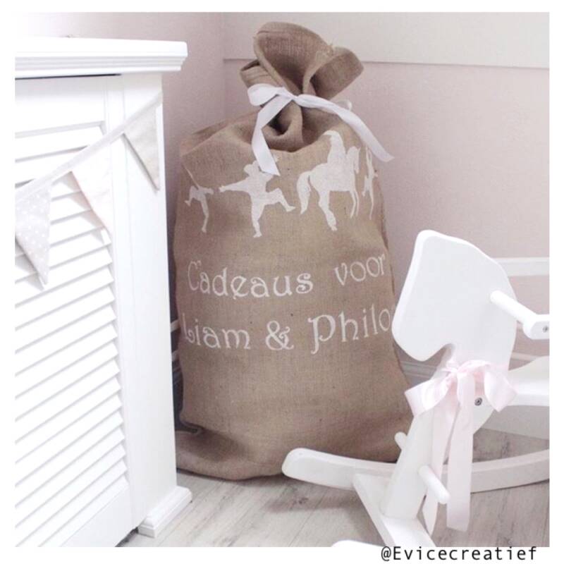 De cadeaus in een jute zak met je naam of familienaam, hoe leuk is dat?